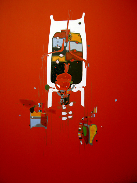 Boho butchers apron Medium: Acrylic, gloss varnish/ glaze, lead render in handmade solid oak box frame. Size: 700x700mm Date:2006 Price upon request.