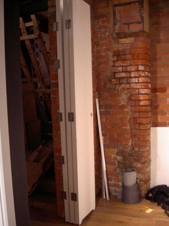 Concertina doors Design build & installation of space saving solution for white wall gallery Cube Mcr. Pine framework/ MDF clad. 2010.