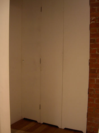 Concertina doors Design build & installation of space saving solution for white wall gallery Cube Mcr. Pine framework/ MDF clad. 2010.