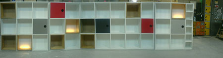 Storage Solutions Storage solutions for private domestic client 2008. Design & build of interchangable storage with light box details. MDF, white acrylic spray finish, birch ply, laminates and perspex.